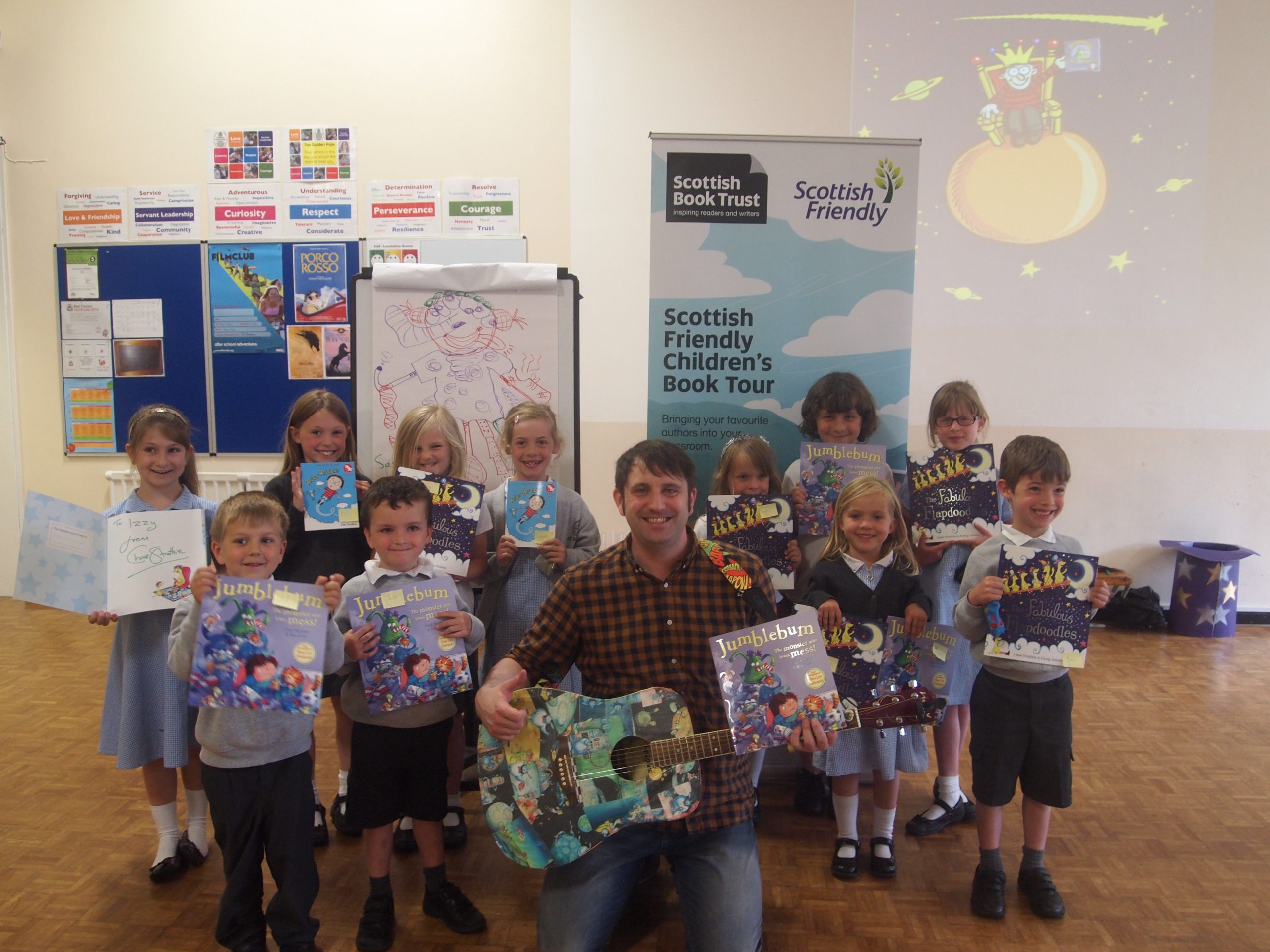 Chae put into practice his philosophy that children are encouraged to read and write when they see books (and their authors) as fun. From leading silly sing-a-longs to inventing strange characters and reaching into his magical StoryHat, his interactive events had even the most reluctant readers reaching for a book. To get them started, Scottish Book Trust gifted 30 copies of Chae Strathie’s ‘Jumblebum’ to every school visited.
