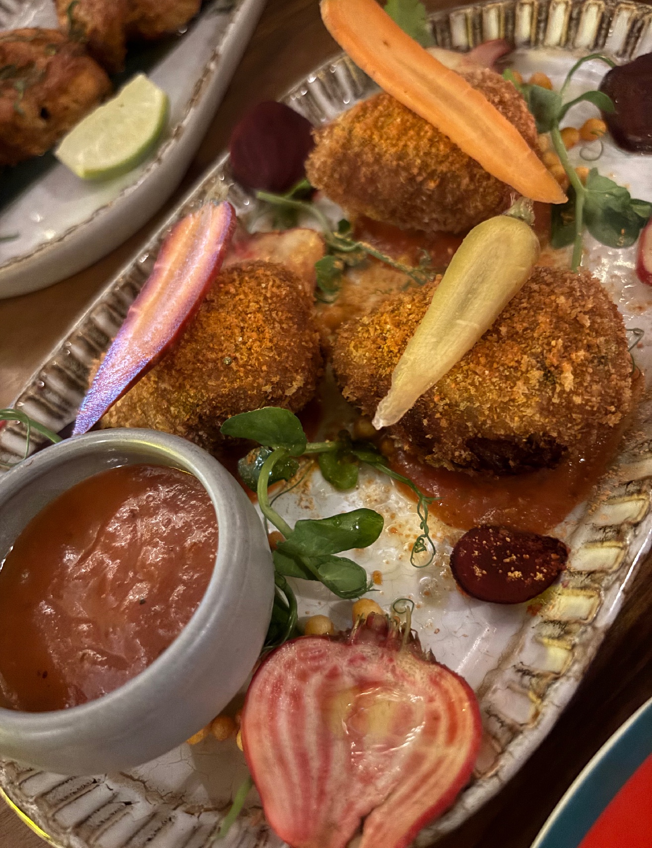 Which of course I did. My chicken chop was a more robustly spiced dish, shredded chicken formed into moist patties that had been breadcrumbed and fried. The spicing was amazing, zinging along but not destroying my palate, that kind of spice skill is admirable, too many times an over heated starter can ruin the rest of a meal but not here. And the cherry tomato chutney was a delicious balm for the whole dish and the thinly sliced heritage carrots and beetroots added a cooling crunch. It looked exquisite but not at the expense of being a satisfying portion of food.