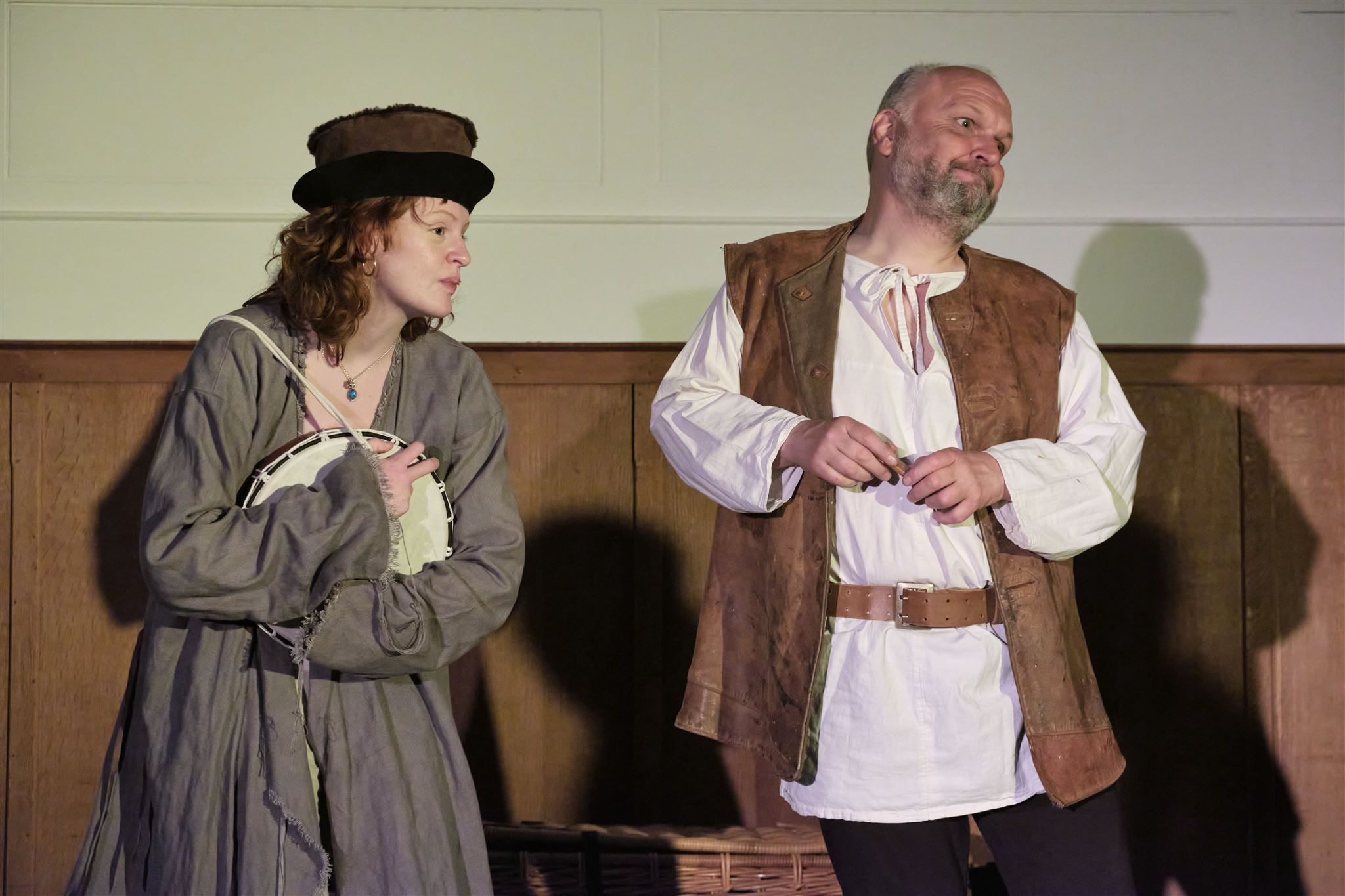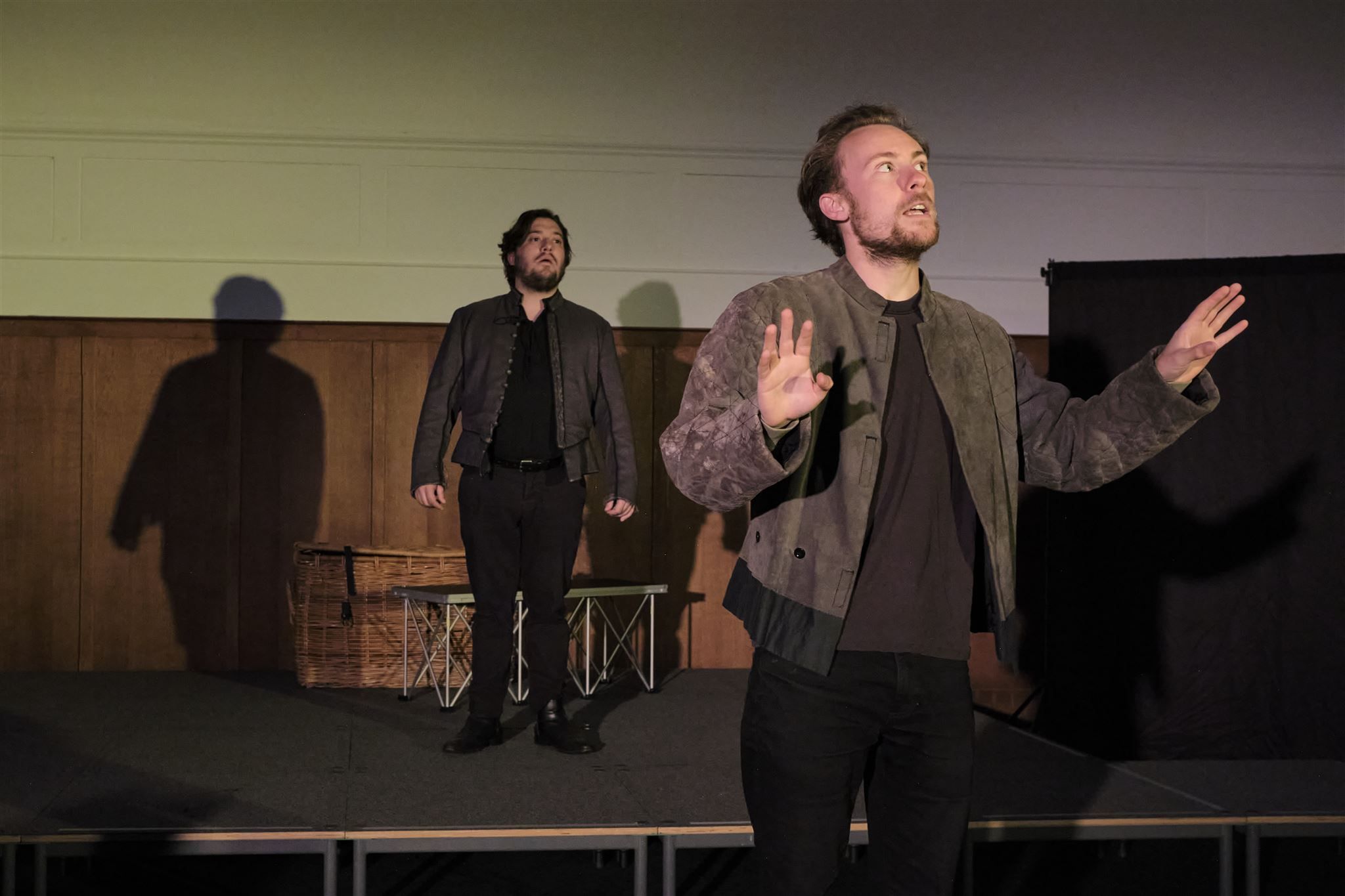 At the core we have Ben Baeza as Rosencrantz and Morgan Corby as Guildenstern, the two student friends of Hamlet, called to the Danish court to… well why are they there? And really that question is the centre of this play, why? This is very fine playing from two very talented local actors. They deliver Stoppard’s dense text with refreshing clarity, the words ringing out above the physical buffoonery. Baeza delivers Rosencrantz as the more challenged of the two, blustering and yet fragile. Croby’s Guildenstern is sharp, confident with a definite air of intellectual arrogance and misguided superiority. They play together so well.