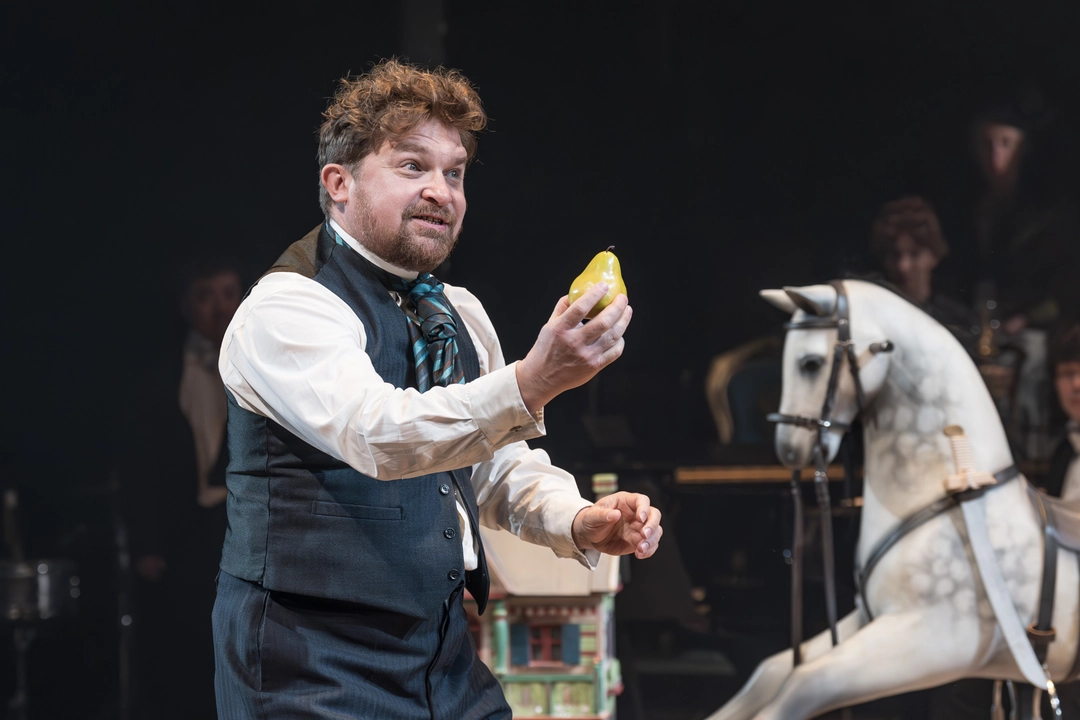 The recurring theme of trains is delivered by the cast emulating the screeching of brakes vocally, a carriage ride by the positioning of three of the now ubiquitous chairs and a tiny rocking horse. And the servant driving the carriage, played by Les Dennis in an evening where he takes on so many roles and so many costume changes, has to endure a barrage of cursing, possibly the most times you will hear the ‘F’ word used on any stage. And once again the cliche emerges that the working classes and servants are portrayed with comedy northern and Scottish accents.