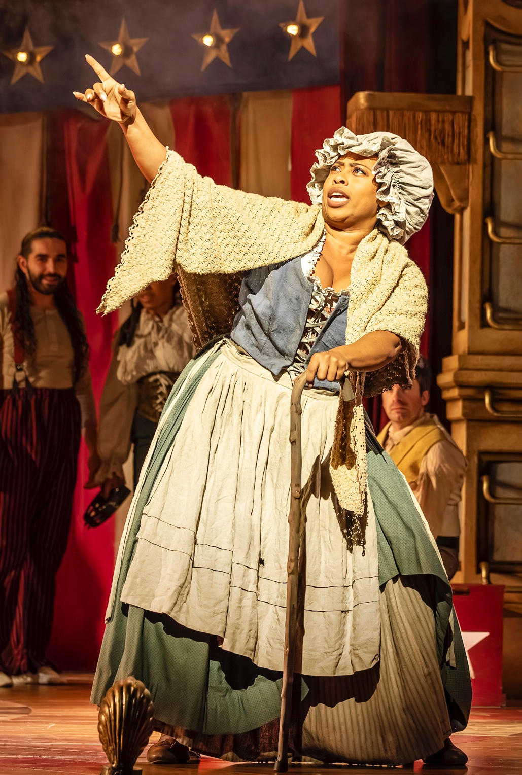 The cast of the show is as large as the show itself. I counted at least 21, but so frantic is the action that there could easily be more. And not only do the majority of them have to multi task musically, they also have to deal with playing multiple roles. They must finish the show exhausted and need a lie down to recover. It seems somewhat unfair not to name each and every one as there is not a weak member of this talented company on stage. That said there are some notable performances. Monique Young is excellent as the weary but tolerant Mrs Barnum, dealing with the bunkum in her own manipulative manner. Penny Ashmore is delightful as Jenny Lind, matching comedy with a soaring and rich vocal performance to which she adds playing the harp, talk about multi tasking!