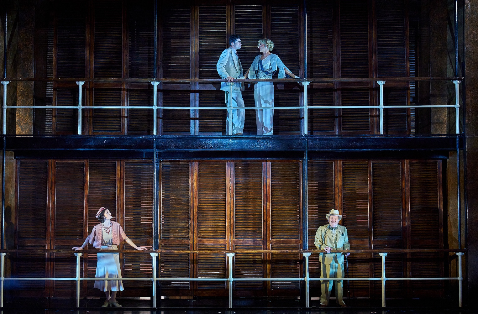 Ludwig’s script is witty, it sticks closely but never religiously to the original, and has some delightful contemporary asides that bring moments of delicious lightness to the evening. Lucy Bailey directs with clarity, yes the cast are given leave to employ the clipped tones of the period but never at the expense of drifting into camp parody. And whilst Britton’s set is wonderfully simplistic in one sense, his costumes are the absolute opposite, lavish confections that shine against the dark wooden slats of the steamer, the women all but one, glamorous and the men all struggling with the heat in multiple layers of linens and tweeds.